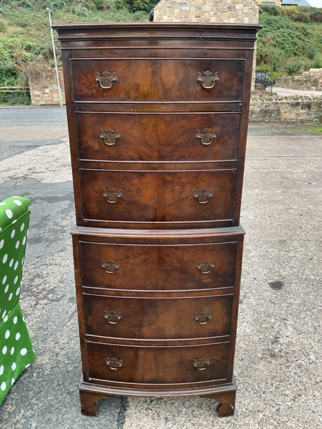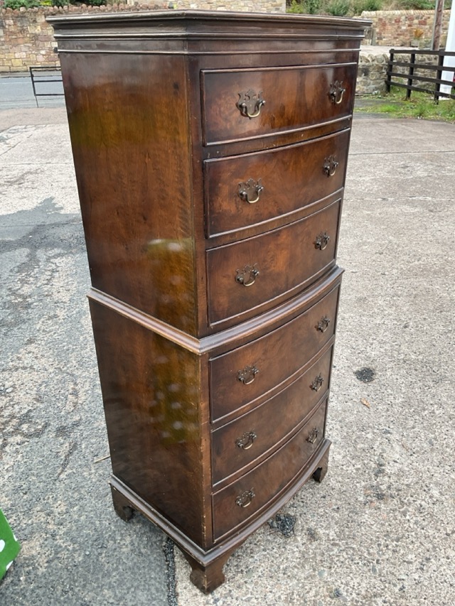 A bowfronted mahogany miniature tallboy with six drawers mounted with brass handles, raised on bracket feet. (21.5in x 16.5in x 51.75in)