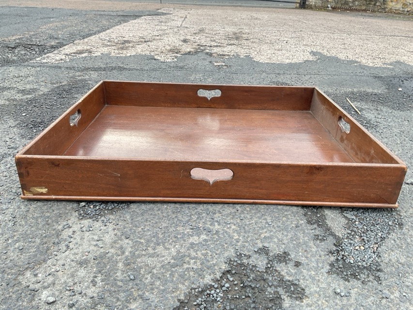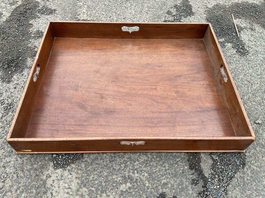A nineteenth century rectangular mahogany butlers tray of dovetailed construction, having pierced handles to all four sides. (30in)