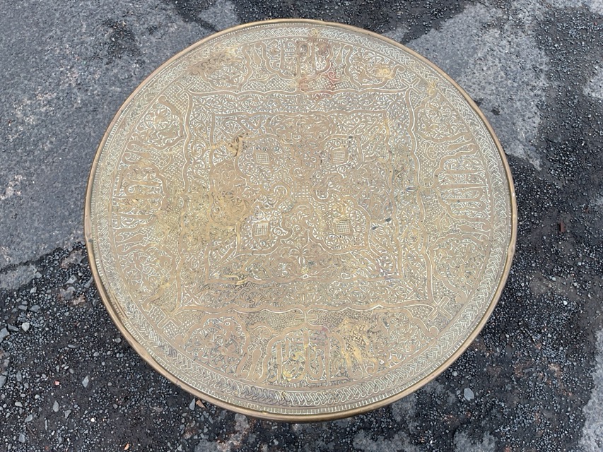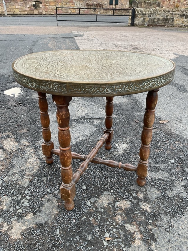 A circular brass topped coffee table with embossed Islamic decoration to tray, supported on folding bobbin turned legs. (23.5in x 22in)