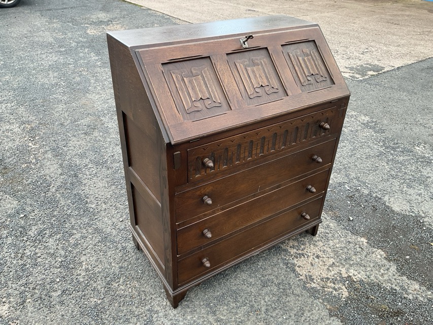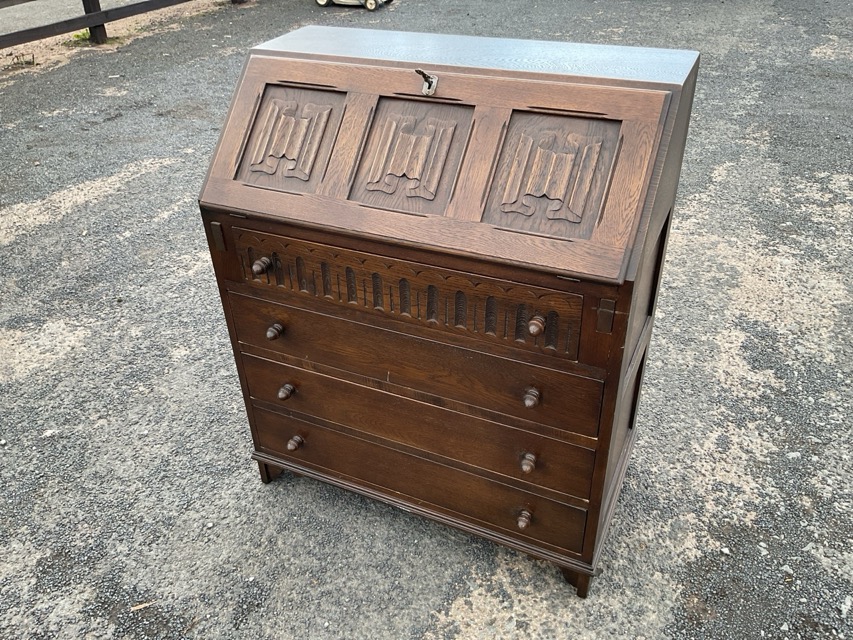 An oak bureau with linenfold panel carved fallfront enclosing a fitted interior, having four acorn knobbed drawers below, the top drawer with fluted carving. (29.75in x 16.5in x 36.25in)