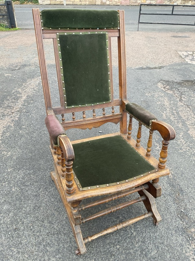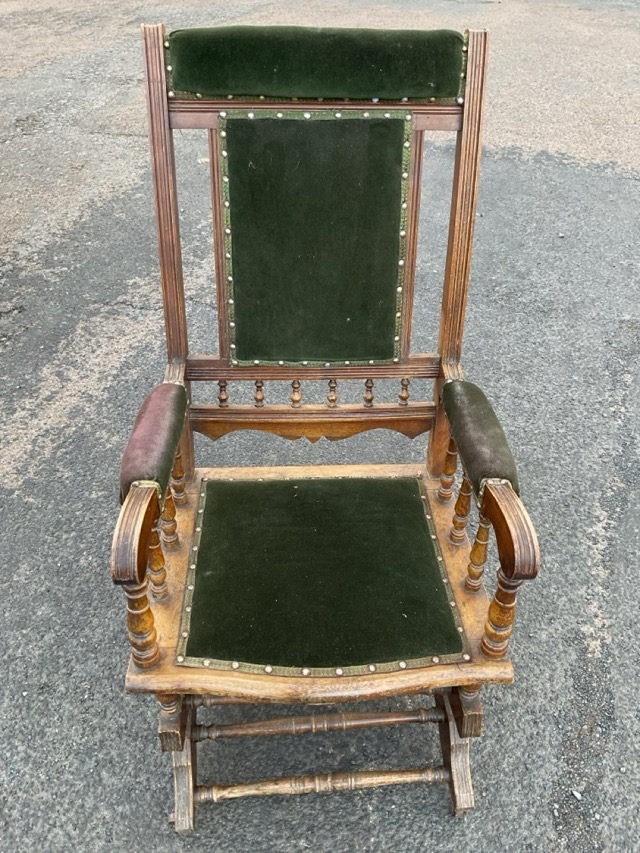 An Edwardian American rocking chair with studded velvet upholstery, the back with moulded frame above gallery spindles, the arms with elbow pads on turned supports, raised on sprung rockers.