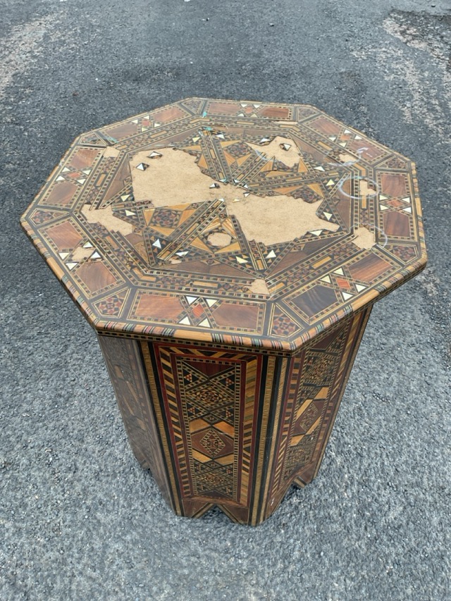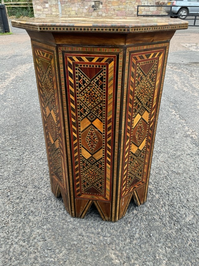 An octagonal North African marquetry occasional table decorated with geometrically inlaid panels in specimen woods, the top fucked. (19.5in x 24in)