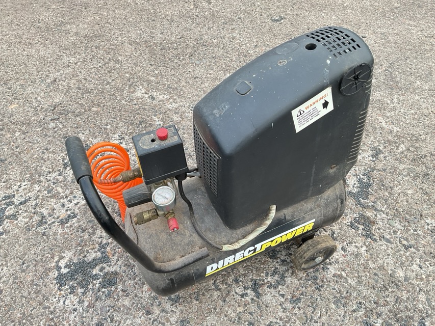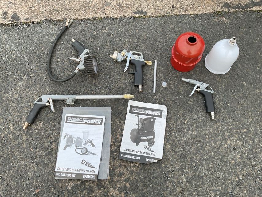 A Direct Power compressor with instruction manual and attachments, spray guns, paint cups, nozzles, etc. (A lot)