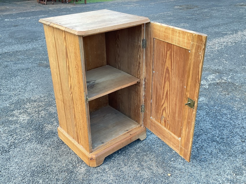 A Victorian pitch pine pot cupboard with canted chamfered top above a panelled door, raised on moulded plinth. (17.5in x 15.5in x 29.5in)