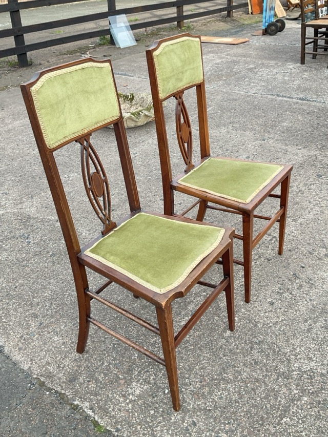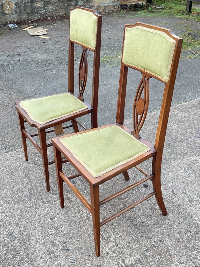 A pair of Edwardian mahogany chairs inlaid with boxwood stringing, the backs with upholstered panels above delicate pierced eliptical splats, raised on square tapering legs. (2)