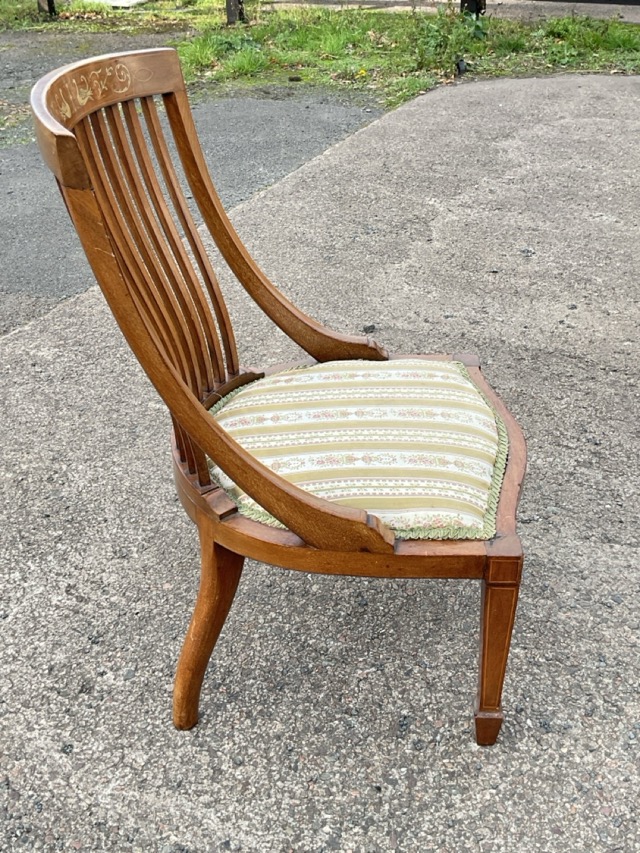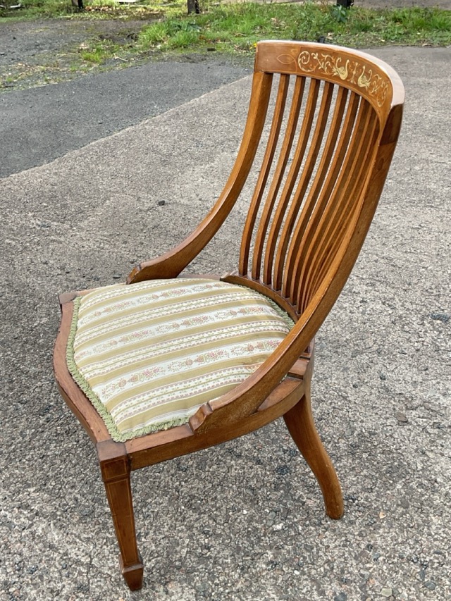 An Edwardian mahogany chair with foliate scroll swan marquetry to back rail above shaped lathes, the bowfronted seat on boxwood strung square tapering legs with spade feet.