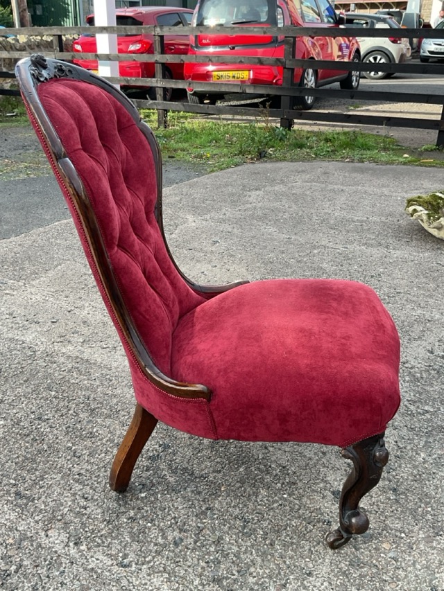 A Victorian mahogany button upholstered spoon-back chair with scrolled carving, the sprung upholstered seat raised on cabriole legs with pot castors.
