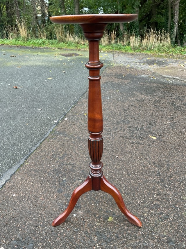 A mahogany jardiniere stand with circular tray top on turned column with fluting, above tripod legs. (36in)