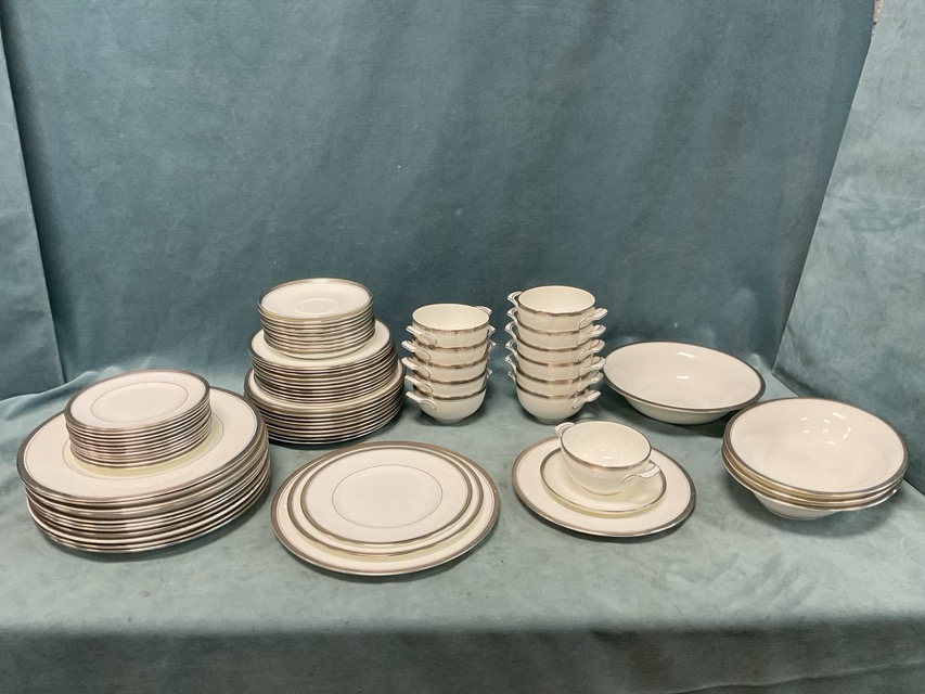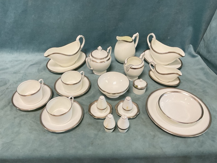 A Coalport dinner service decorated in the Elite pattern having geometric silvered rims - plates, cup & saucers, cruets, jugs, suaceboats, soup bowls, serving dishes, etc. (A lot)