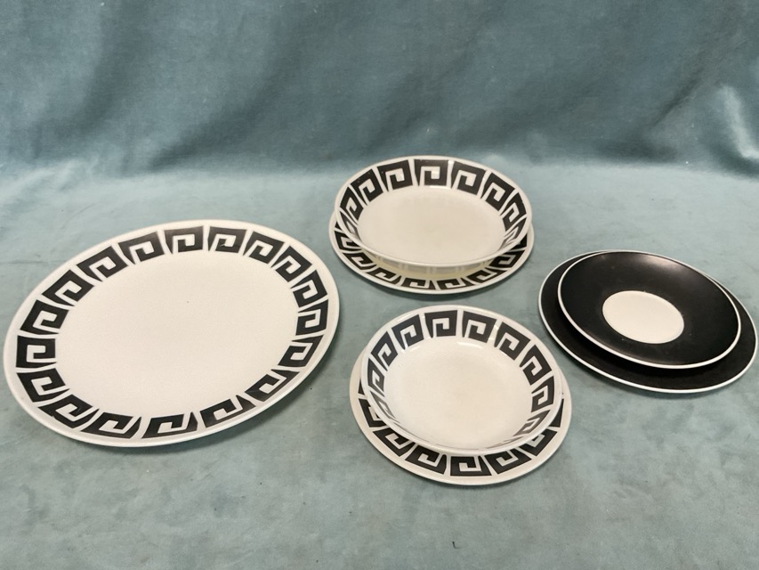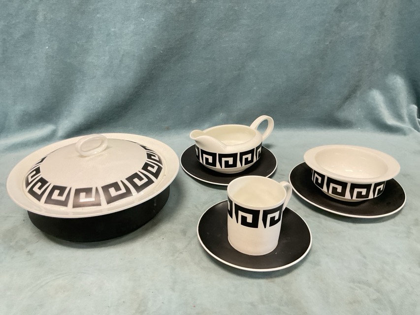 A 70s Susie Cooper black & white breakfast/dinner service decorated in the Keystone patten - turrines & covers, plates, bowls, jugs, cups, etc. (A lot)
