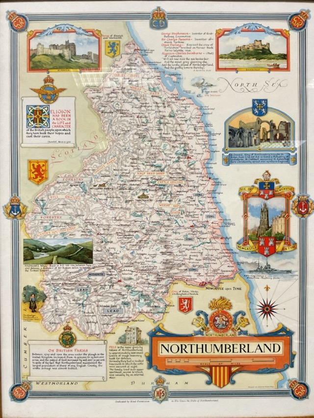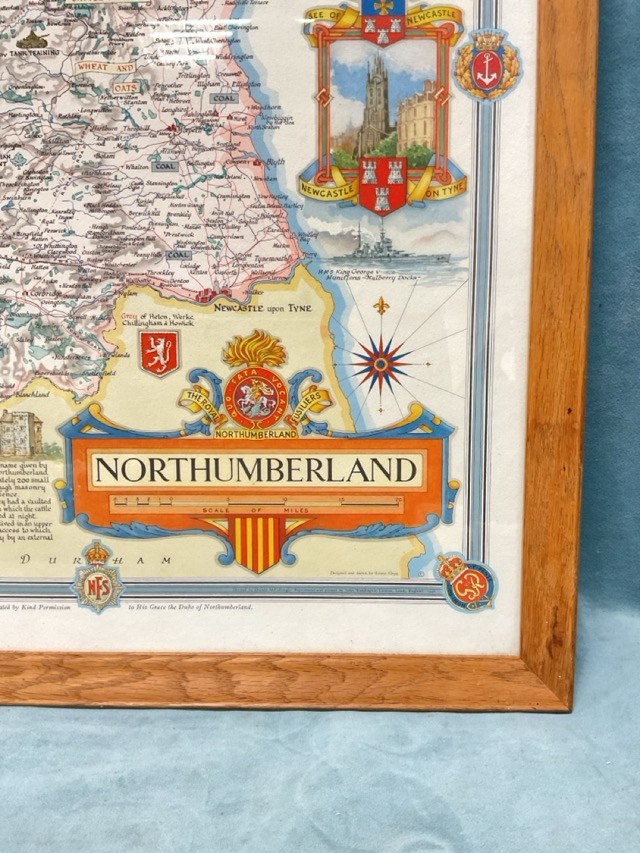 A 1946 oak framed map of Northumberland, the coloured plate with notable landscape cartouches, from the Countryman County Maps of Britain edition after Ernest Clegg. (16.75in x 22in)