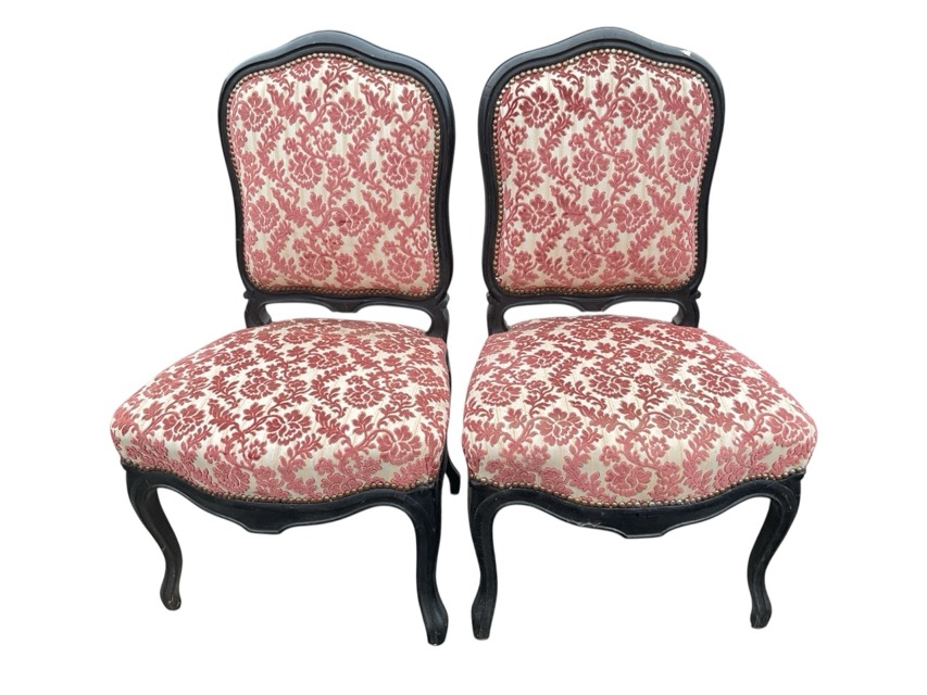 A pair of Victorian ebonised brocade upholstered side chairs with shield shaped moulded studded backs above sprung seats, raised on cabriole legs. (2)
