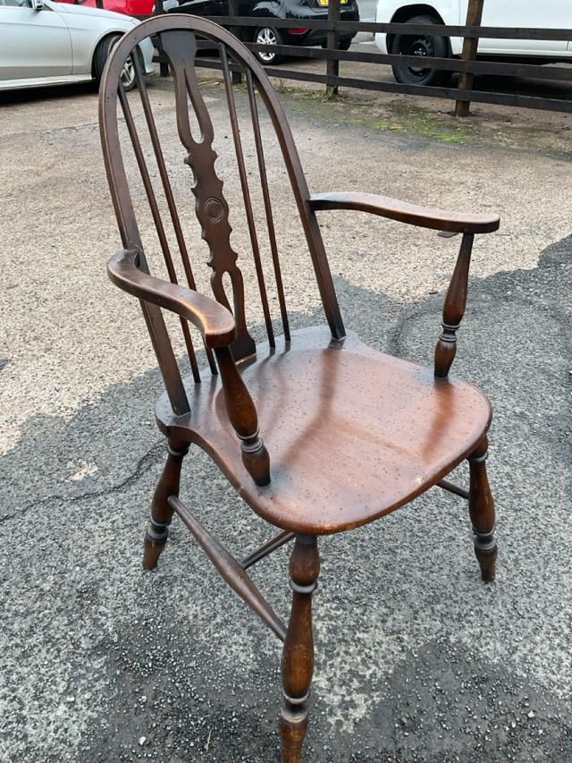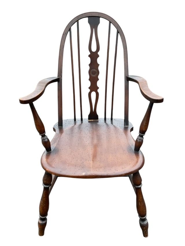 A windsor chair having hooped back above splat with carved roundel flanked by spindles, the saddle shaped seat on turned legs & stretchers.