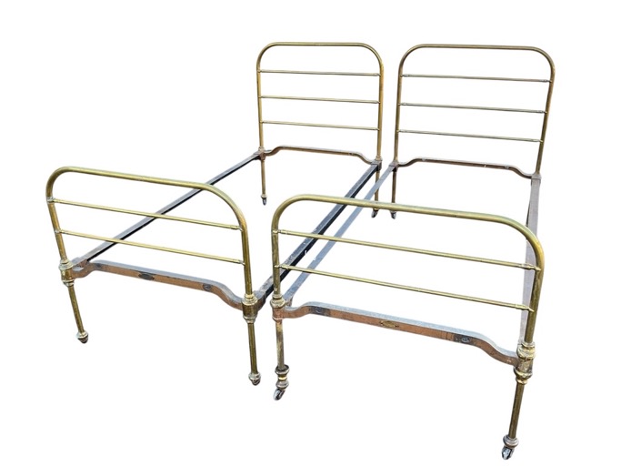 A pair of Edwardian Heal & Son brass beds of tubular construction having rounded ends, the cornerposts on castors joined by angleiron side rails. (36.75in x 79.25in x 46.5in) (2)