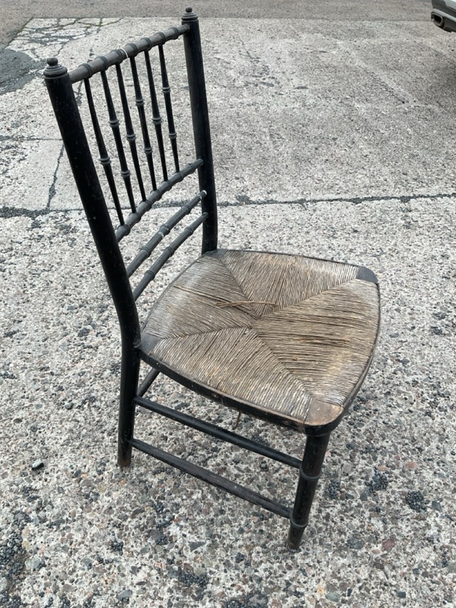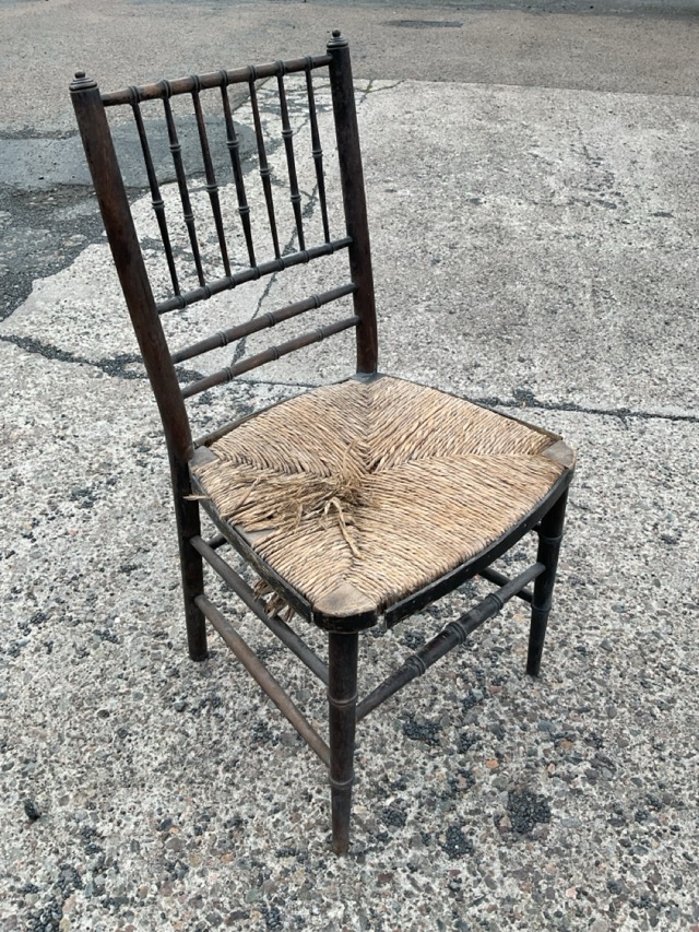 A pair of Victorian rush seated chairs with fine spindle turned backs on ring-turned tapering legs & stretchers - one reduced. (2)