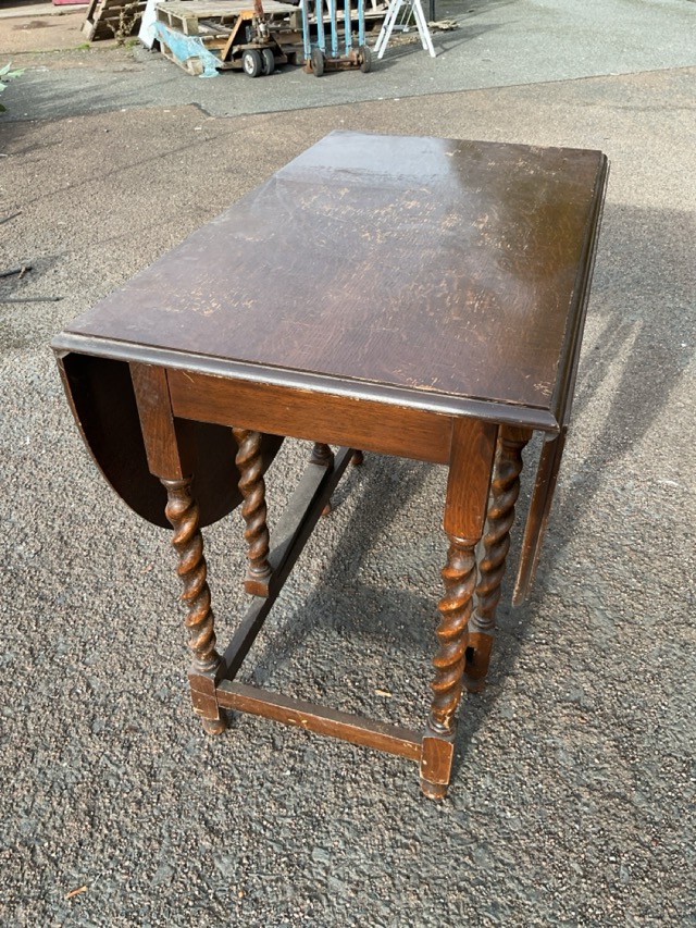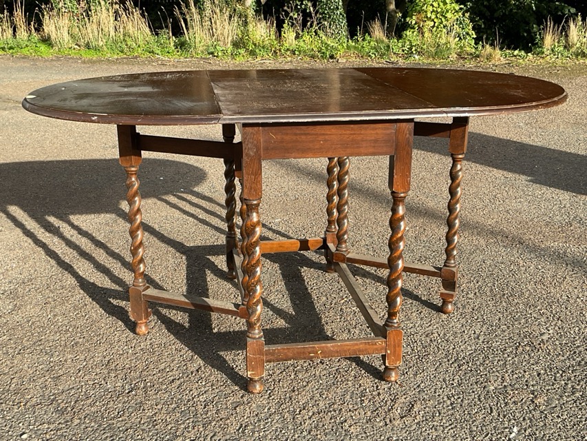 An oak drop-leaf dining table, having two leaves opening on twisted swing gate legs, joined by rectangular stretchers. (58in x 35.75in 29in)