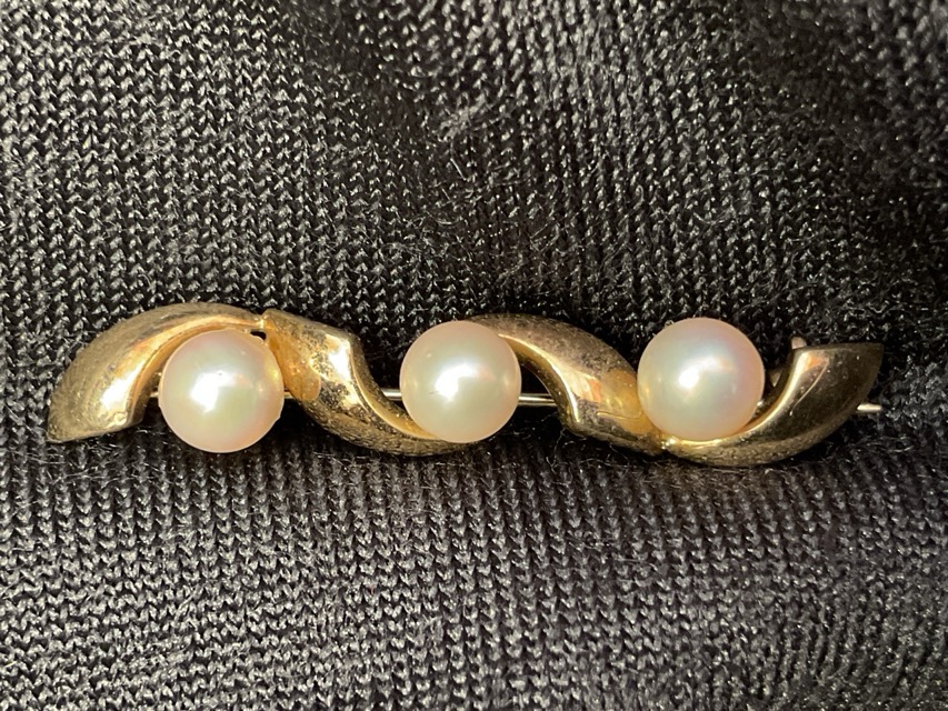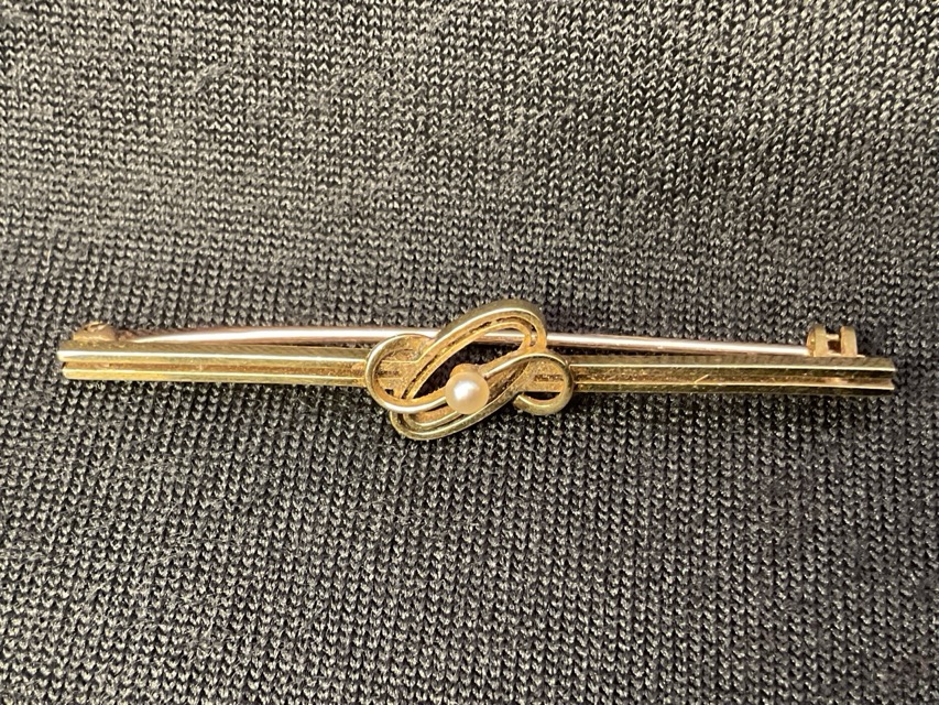 A 15ct gold bar brooch having central oval knot design with seed pearl - 2.5g; and a 9ct gold brooch with three 5mm pearls - 1.8g inc. pearls. (2)