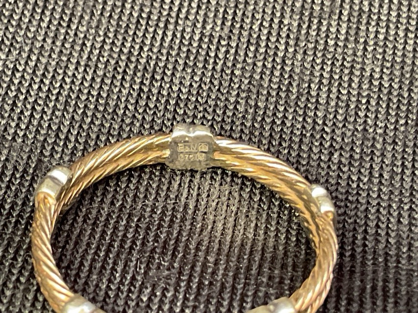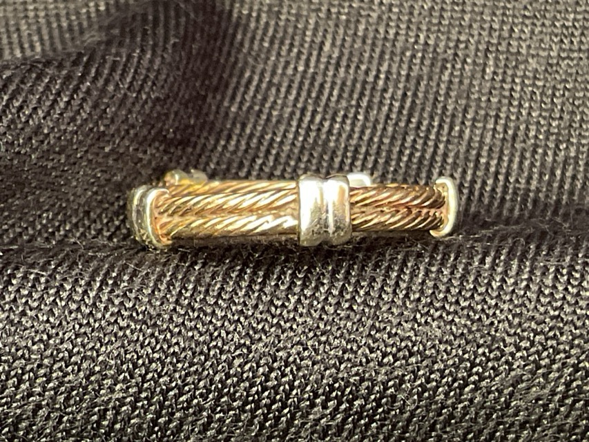 A 9ct white and yellow gold ring in the form of a pair of ropes tied together - size Q. (2.4g)