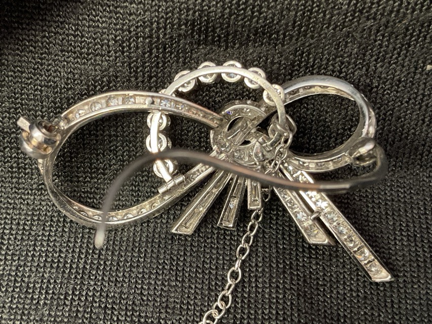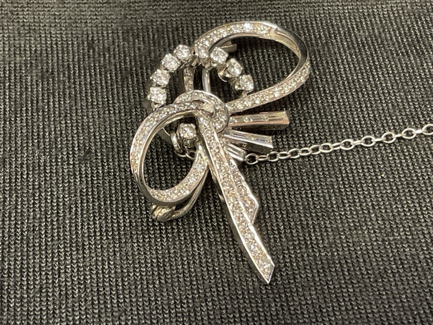An 18ct white gold diamond brooch, with 69 round and 6 baguette cut stones arranged in a bow, having safety chain - diamonds assessed as H/I & VS/1/2. (2in) (8.4g total)