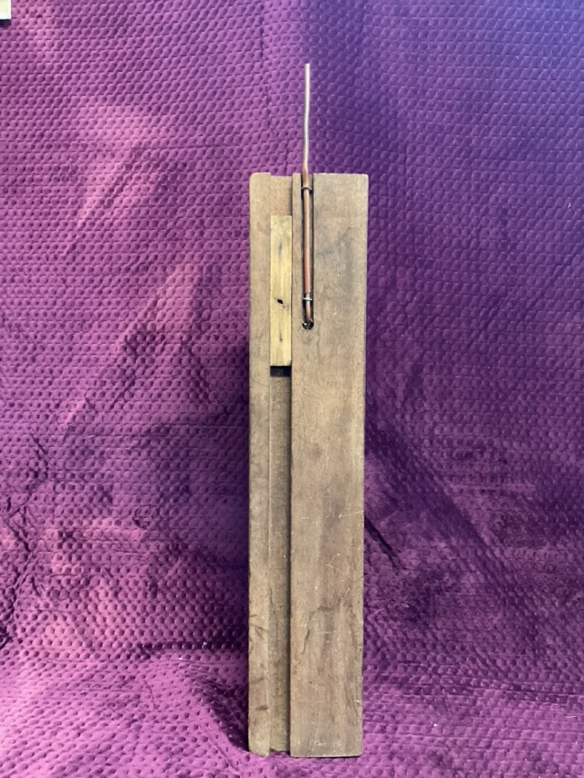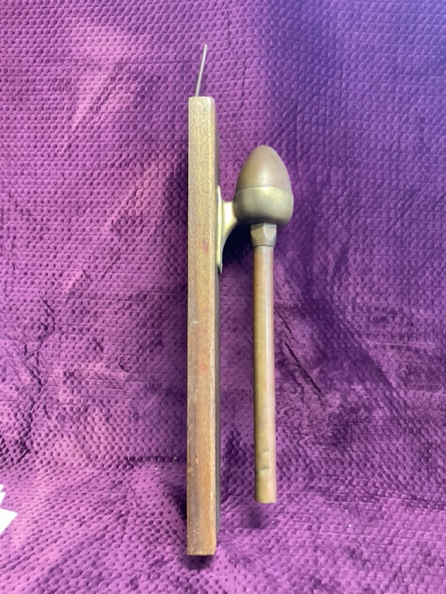A copper and brass steam locomotive whistle with acorn shaped bulb above a cylindrical tube, mounted on a rectangular mahogany panel. (30in)