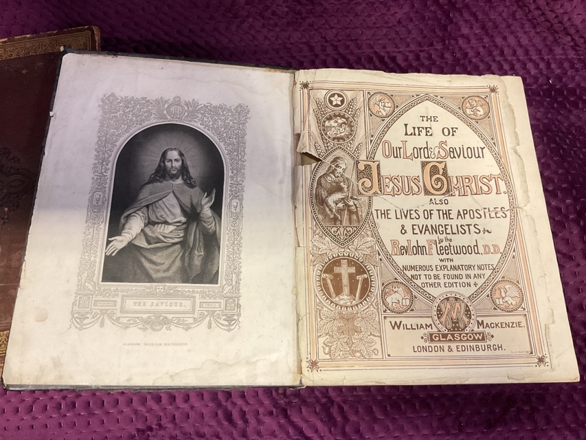 A Victorian Browns Self Interpreting Bible with elaborate gilt tooled leather binding and gilt edges; and The Life of Our Lord and Saviour Jesus Christ by Rev John Fleetwood, leather bound with gilt tooled spine, each with numerous engraved illustrations. (2)