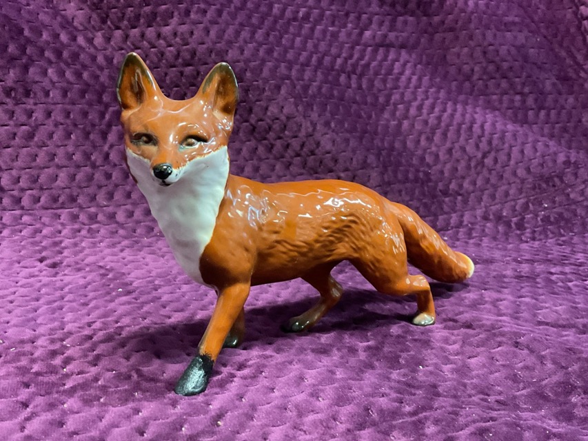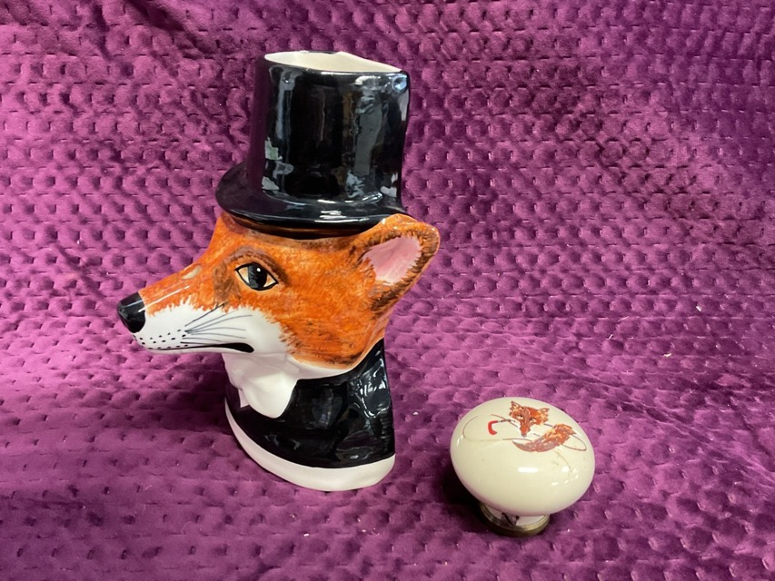 A handpainted Babbacombe Pottery string dispenser in the form of a fox bust in hunting attire - 6.75in; a Beswick walking fox; and a Victorian ceramic knob handpainted with a fox head, brush and whip. (3)