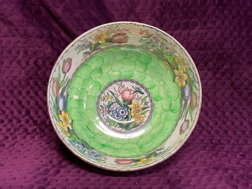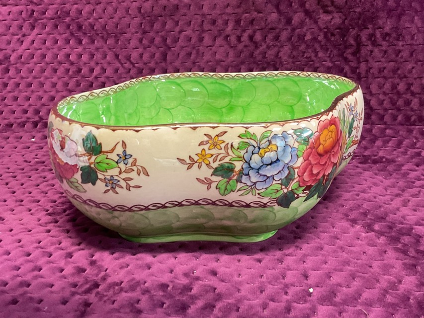 A Maling green lustre quatrefoil fruit bowl in the Peony Rose pattern, and a similar Maling circular bowl in the Springtime pattern. (2)