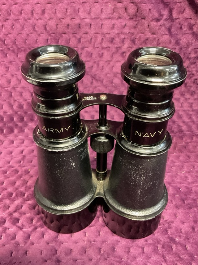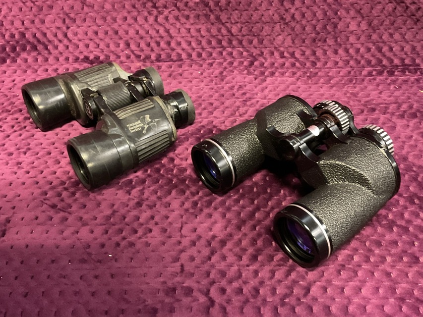 A pair of 1916 WWI French made binoculars; a leather cased pair of Swallow 9 x 40 wide angle binoculars; and a pair of Bushnell 13-201C 10 x 42 binoculars. (3)