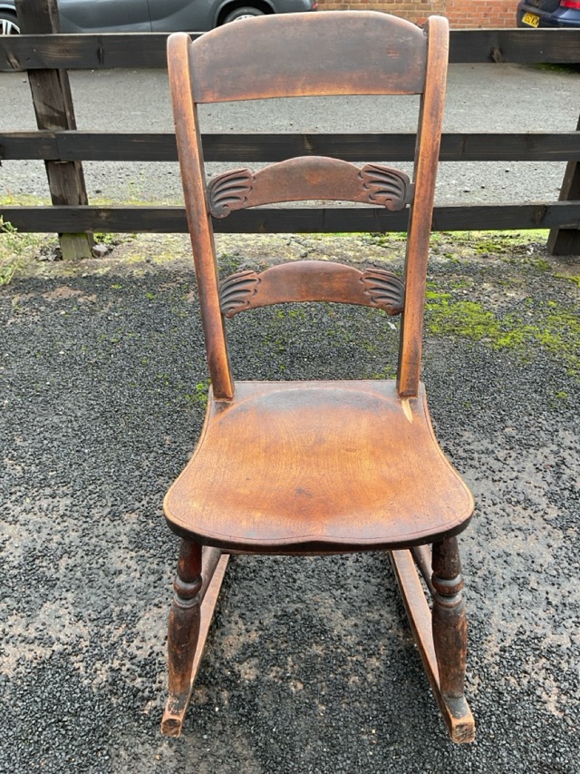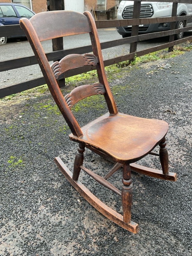 A nineteenth century country birch rocking chair with scrolled chisel carving to back rails, the solid shaped seat on turned legs with shaped rockers.