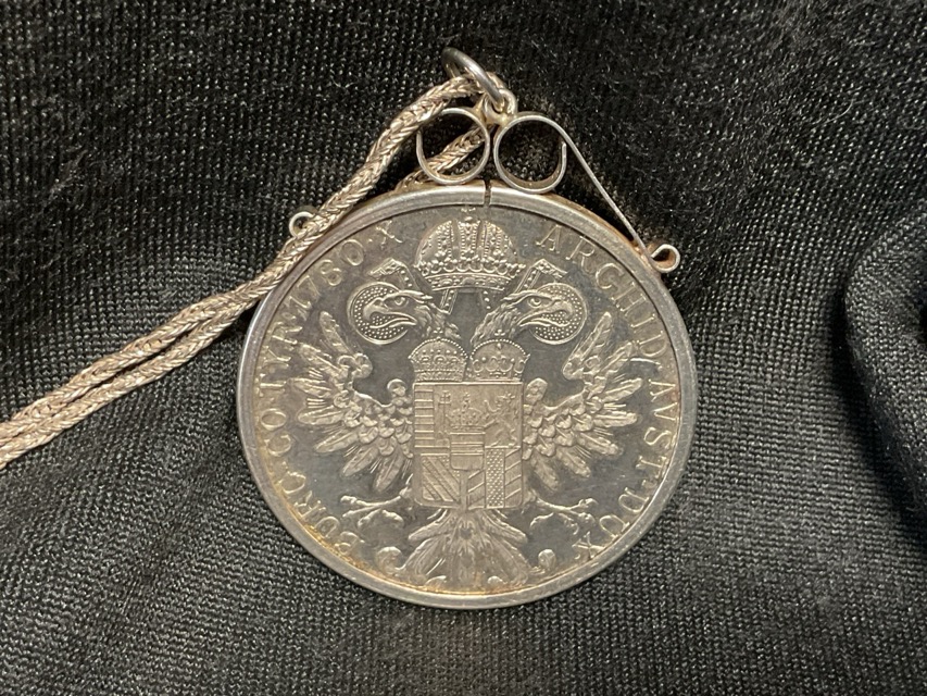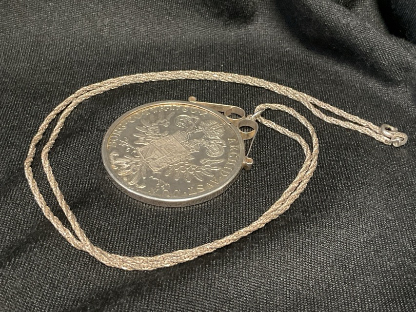 A Maria Theresa silver Thaler coin with 1780 date, mounted as a pendant on a chain - 1.75in dia. (37.9g)