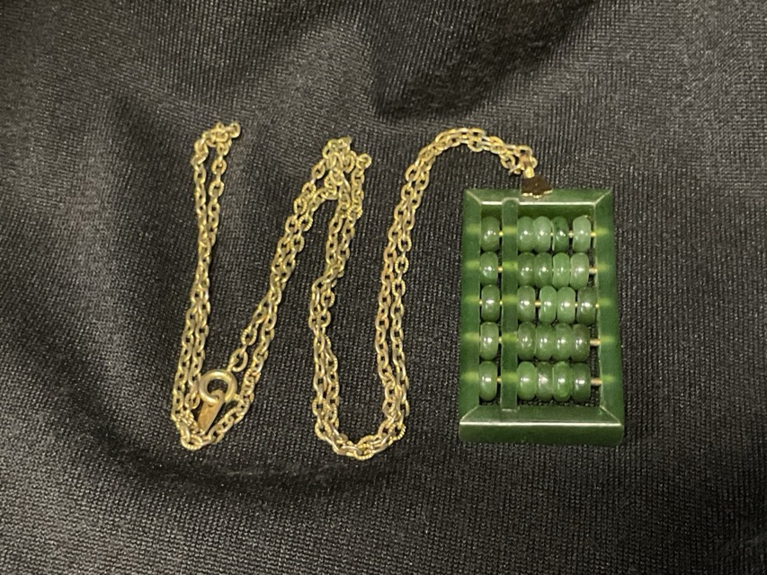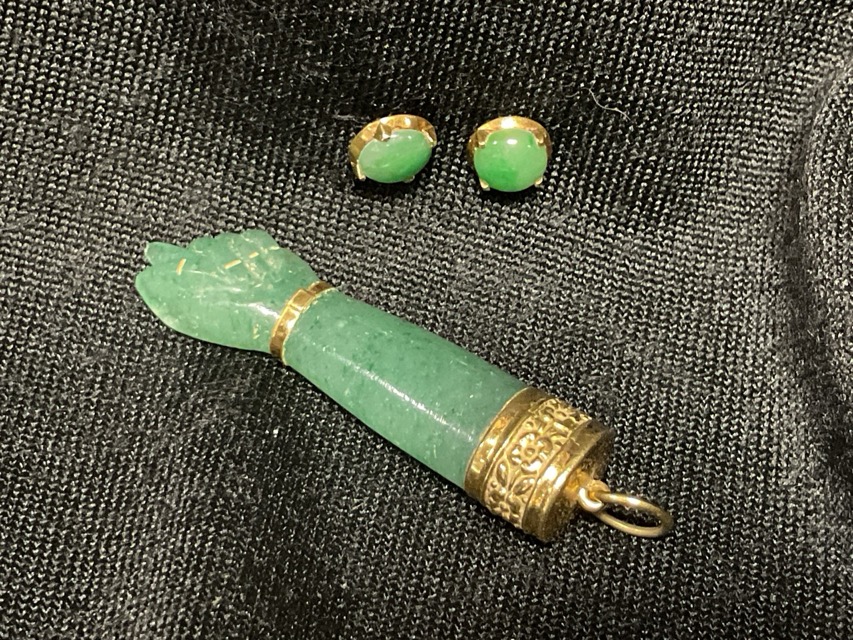 A gold mounted carved jade pendant depicting a fist doing a manu fica gesture; a pair of cabochon jade stud earrings; and an oriental carved jade abacus necklace. (3)