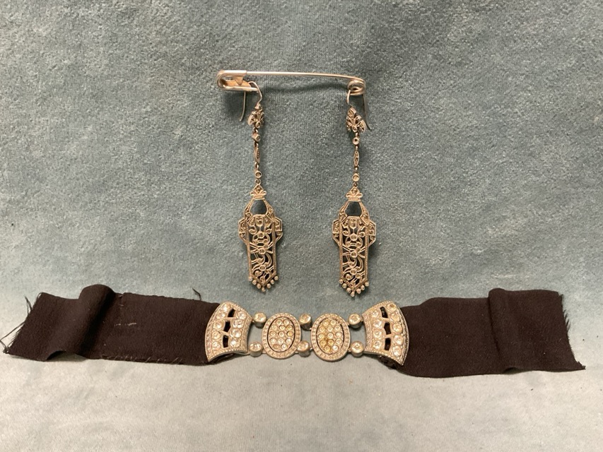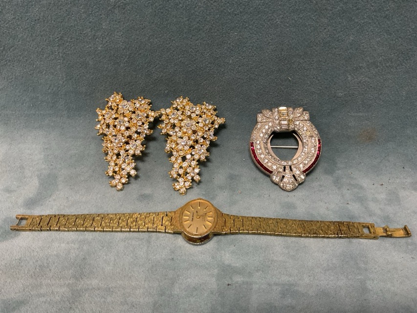 A boxed pair of deco style silver and marcasite drop earrings; a Jean Renet gold plated ladies wristwatch; a triangular pair of diamanté clip-on earrings; a circular deco style clip/brooch with white & red stones; and a C20th diamanté buckle on crepe silk sash. (5)