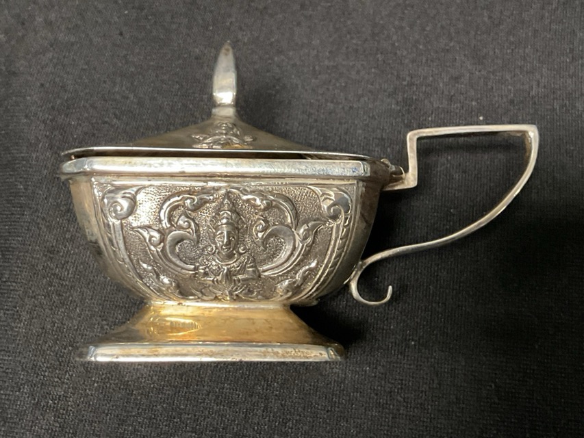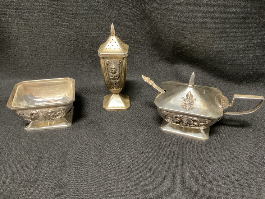 A pair of boxed Thainakon sterling silver cruets, decorated with embossed deities having glass liners. (2) (289.5g)
