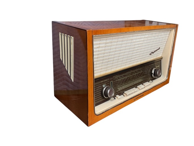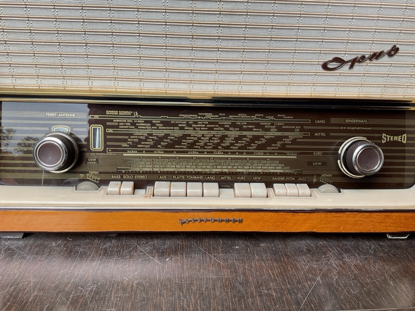 A 1960s Telefunken Opus stereo valve radio in walnut case having glass dial, fabric speaker cover, gilt trim, etc. (26.75in)
