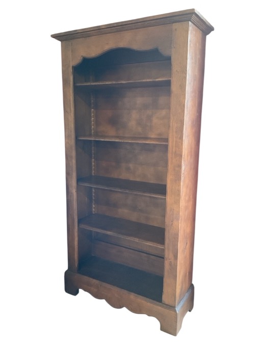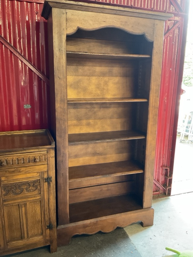 A tall oak bookcase with moulded cornice above a shaped apron, having five adjustable shelves above a conforming waved plinth. (41.25in x 15.5in x 79in)