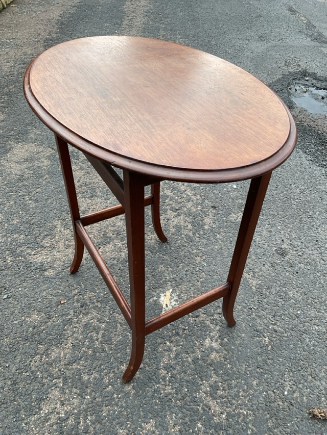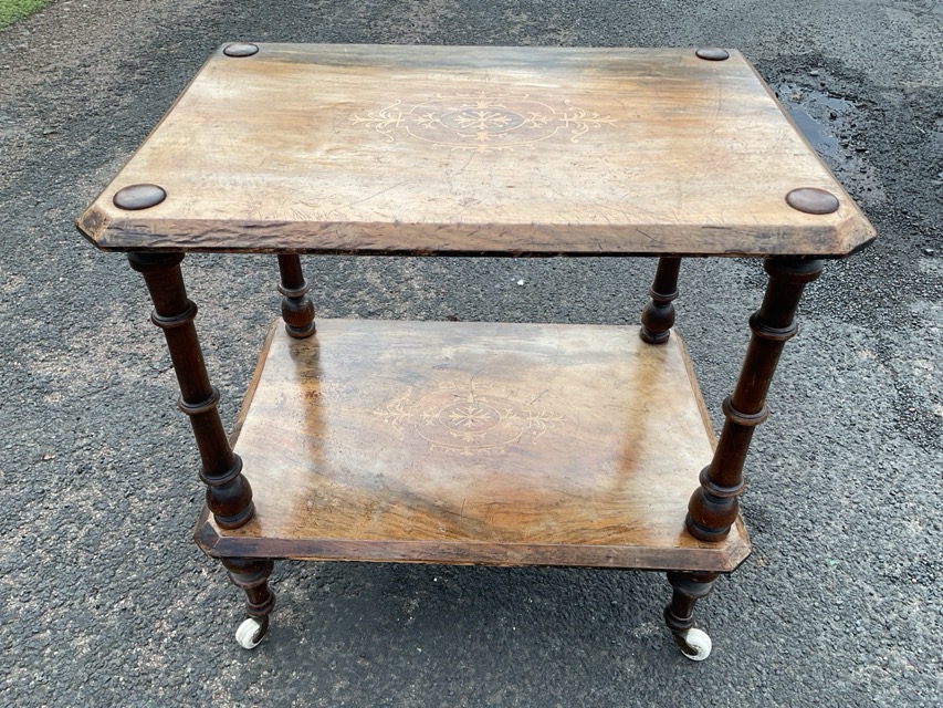 A Victorian walnut whatnot with two chamfered shelves having foliate inlay, raised on turned legs with pot castors - reduced; and an oval mahogany occasional table on square tapering legs. (2)