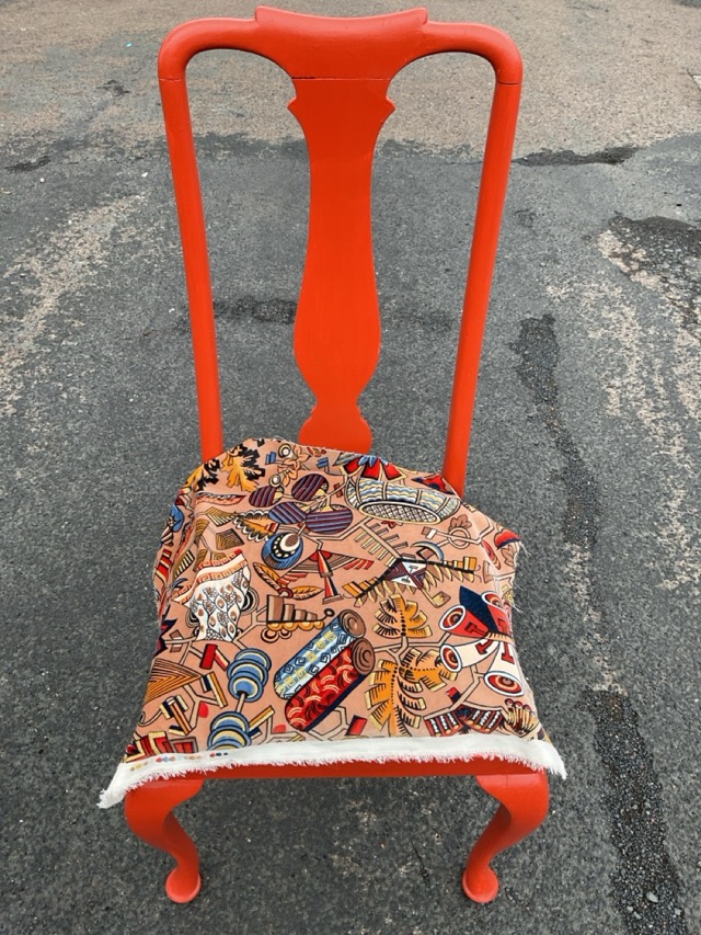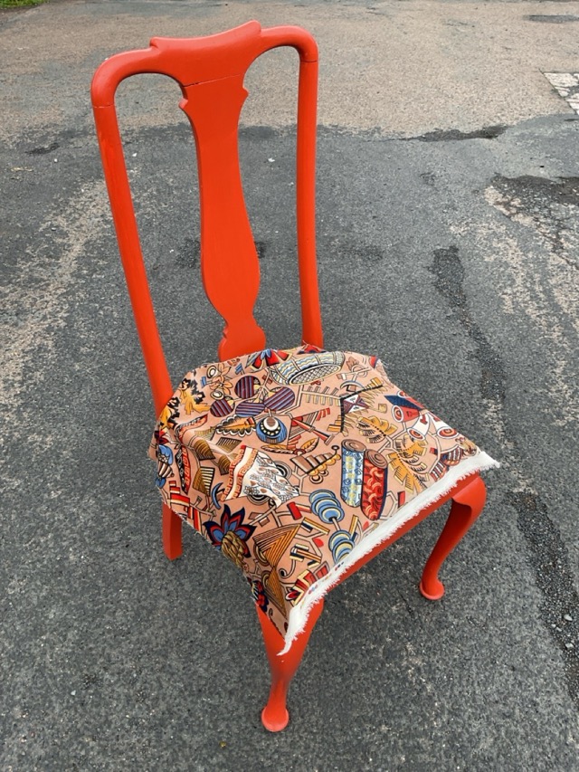 A painted Queen Anne style chair with vase shaped splat above contemporary graphic print material chosen for seat, raised on cabriole legs.