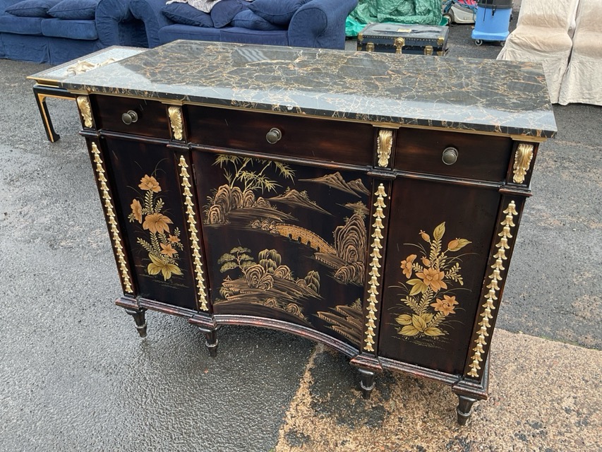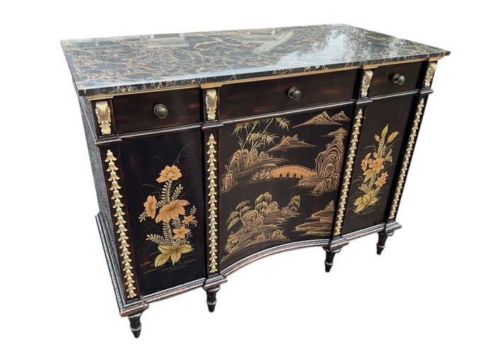 A reproduction ebonised gilt side cabinet having Breccia marble top above three frieze drawers and a concave chinoiserie landscape cupboard flanked by floral panels bordered by gilt bell type pilasters, raised on turned legs. (50in x 24.75in x 38in)