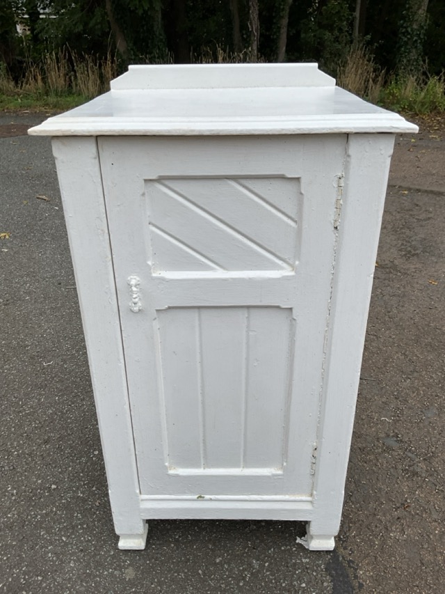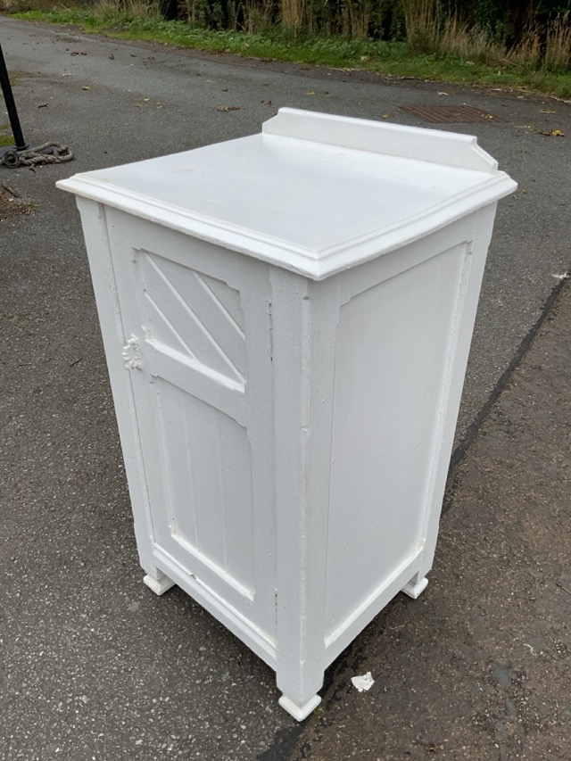 A painted Edwardian pot cupboard with tongue & grooved chamfered panels to door, raised on shaped waisted feet. (17in x 14.75in x 30.5in)