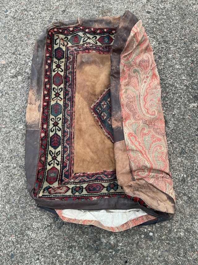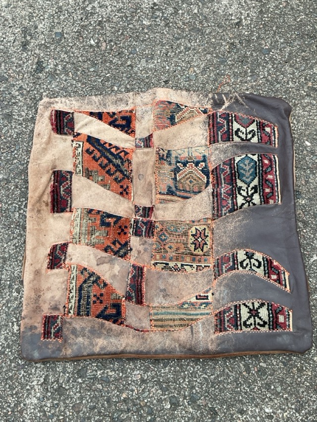A leather and antique Persian carpet appliqué cushion cover woven with lozenge medallion within stylised flowering vine borders - 32in x 32in; and another similar with geometric carpet and suede patchwork - 25in x 26in. (2)