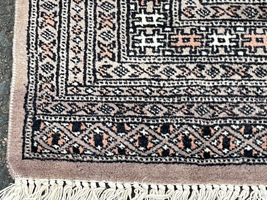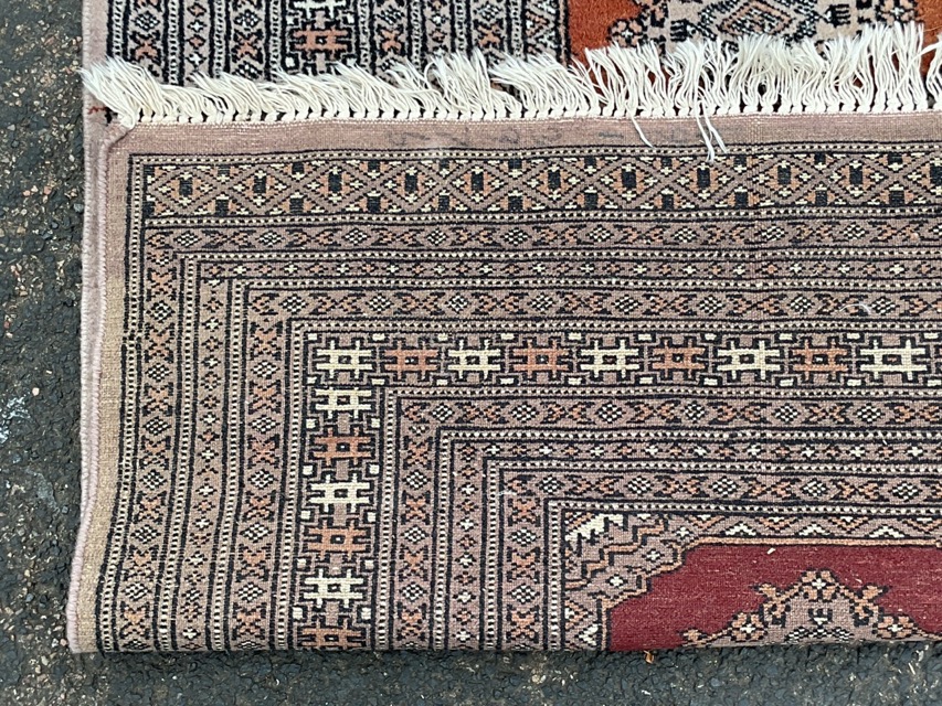An Afghan Turkmen wool rug woven with two rows of six lozenge medallions on coffee coloured compartments, within multiple geometric borders. (74in x 50in)