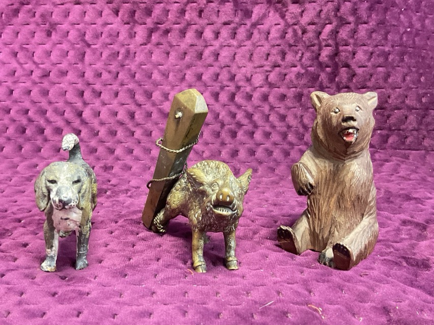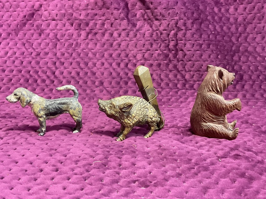 A cold painted foxhound; a C19th French bronze wild boar tied to a post; and a small Black Forest carved limewood seated bear. (3)