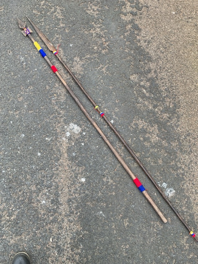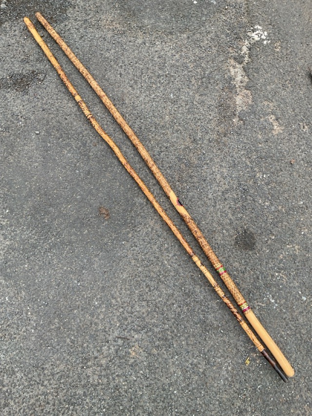 An Aboriginal staff with geometric painted and pokerwork decoration with solar eclipse motif; another with carved head finial and pokerwork leaf, fish, and flame decoration; and two Caribbean island cane spears with decorative coloured yarn bindings. (70in) (4)