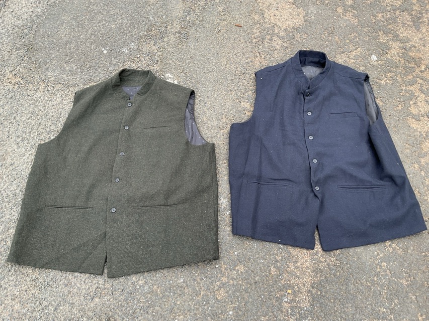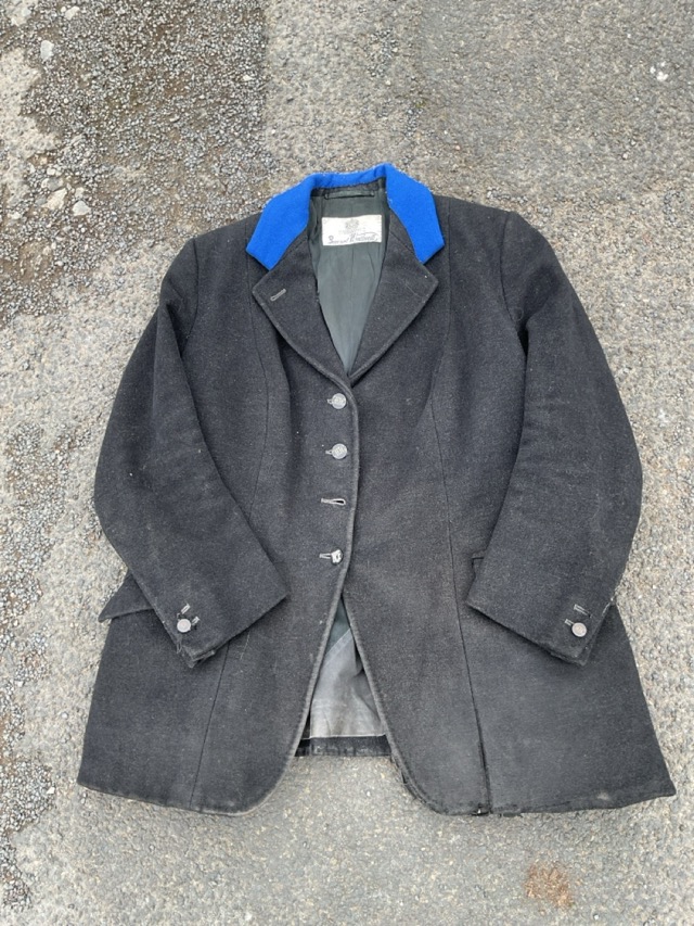 A Bernard Weatherill ladys black wool hunting jacket with blue collar and monogrammed buttons; two herringbone tweed style shooting jerkins with slit pockets; and two pairs of twill cricket trousers. (5)