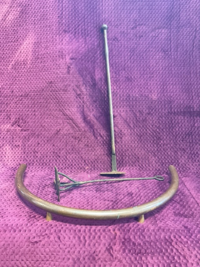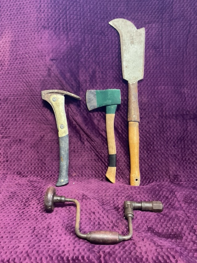 Miscellaneous tools - an Eastwing Weight Forward claw hammer, a hatchet, a billhook, a blacksmiths forge rake, a WL branding iron, a brace, and tubular copper semicircular fender, etc. (7)