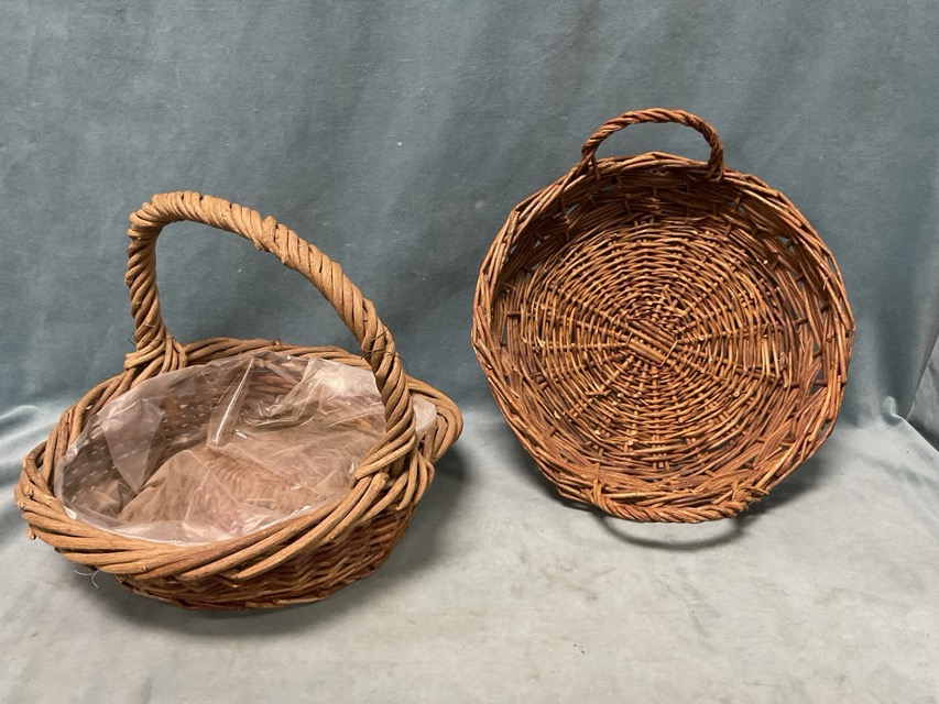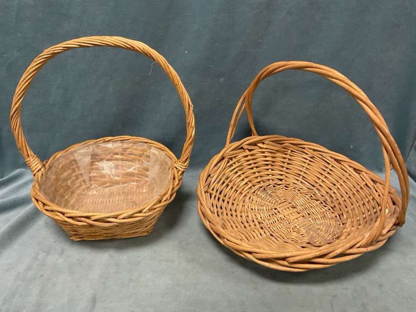 Three hoop cane wicker flower baskets; and a circular twin handled fruit picking basket. (4)