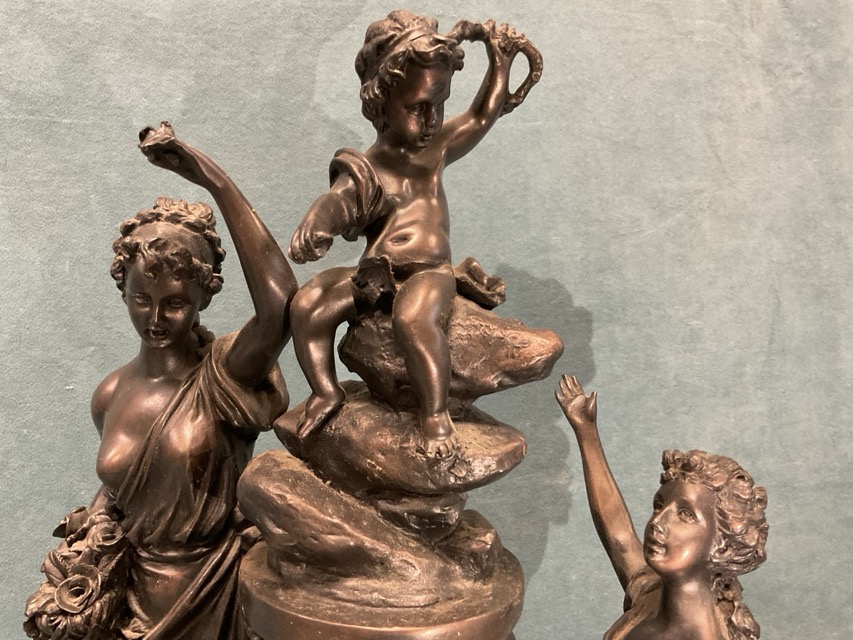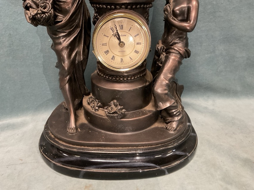 A contemporary faux bronze mantle clock, having central dial with roman chapter ring, framed by a trio of classical figures, raised a marble effect plinth. (12.5in x 9.5in x 19in)