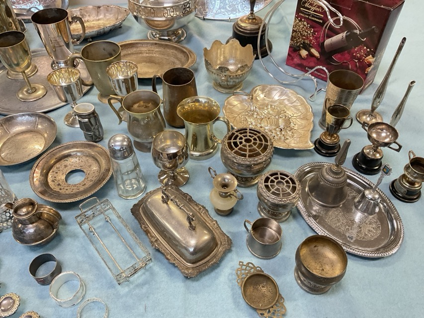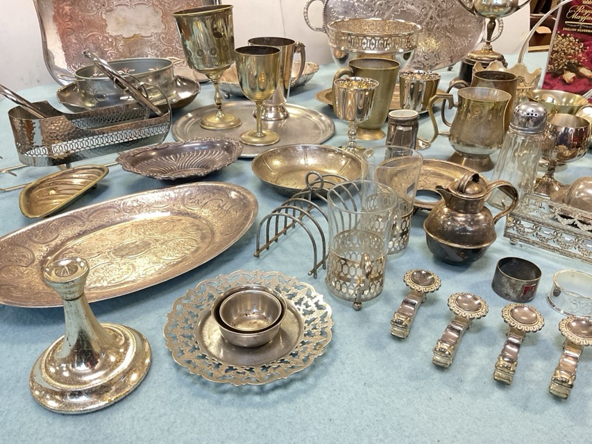 Miscellaneous silver plate - trays, trophy cups, bowls, bottle cradles, dishes, flower vases, tankards, a toast rack, a bell, etc. (A lot)