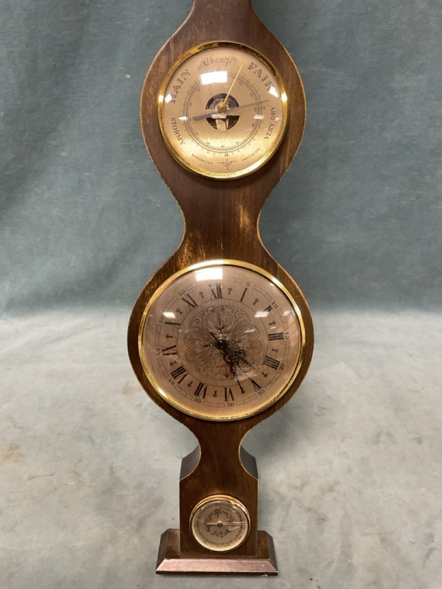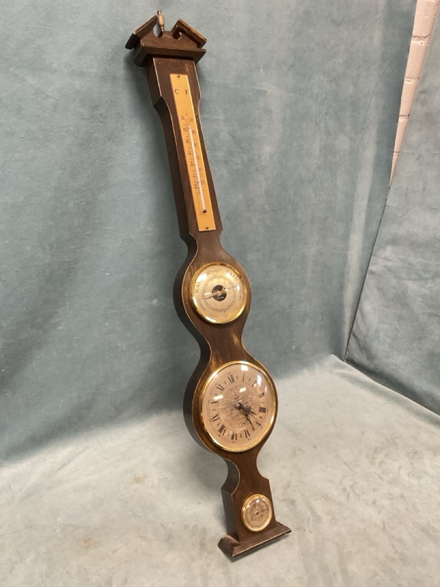 A Georgian style barometer of traditional form with pediment above thermometer, barometer, clock & hygrometer. (34in)