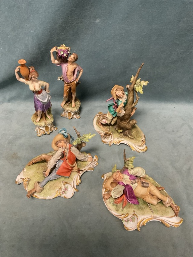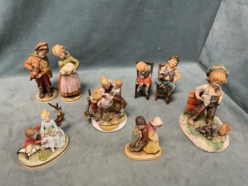 A collection of Capo di Monte figurines - pairs, children, three musketeers on scrolled bases, dancers, etc. (13)